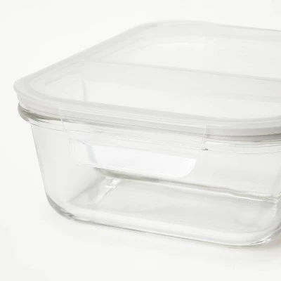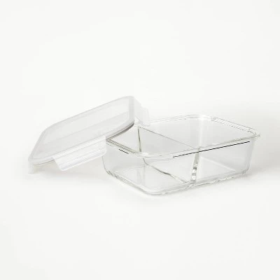 Meal prep or pack lunches for work with the help of this Glass Bento Food Storage Container from Figmintâ„¢. Made from clear glass, this six-cup bento container features two divided compartments, making it perfect for separating veggies from dip or entrees from sides. The snap lid locks in freshness and helps keep the contents secured, and the container is dishwasher and freezer safe for easy cleaning and storage.